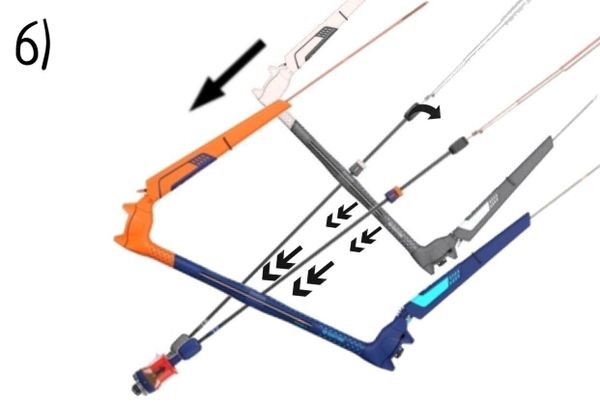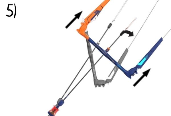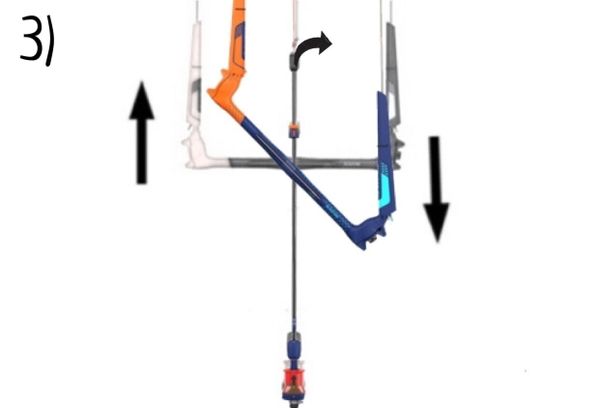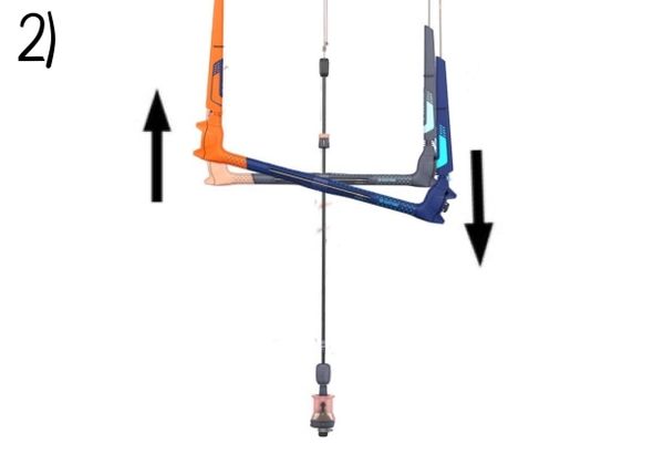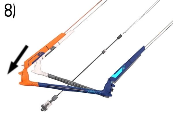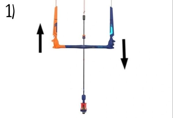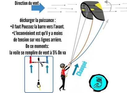 Quand vous poussez la barre loin de vous « de-power ». Vous êtes en sécurité car vous ôtez la puissance du kite. Par contre, il y a moins de tension dans les lignes arrières. Le kite va réagir plus lentement ou pas du tout.