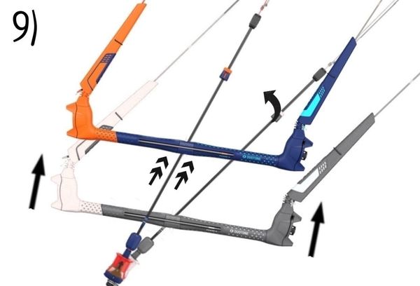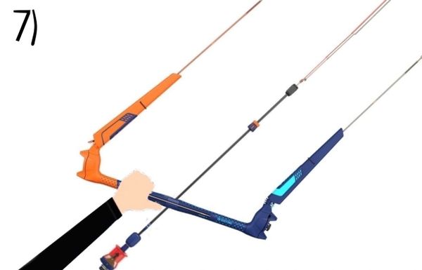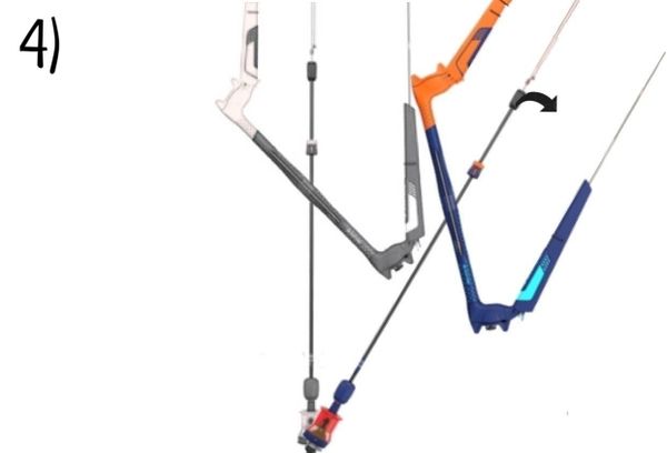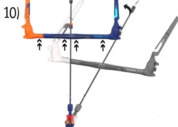 - Bien évidemment, avant même de vous déplacer pour le décollage, pensez à retourner la barre dans le bon sens et à connecter votre leash sur la ligne de sécurité.