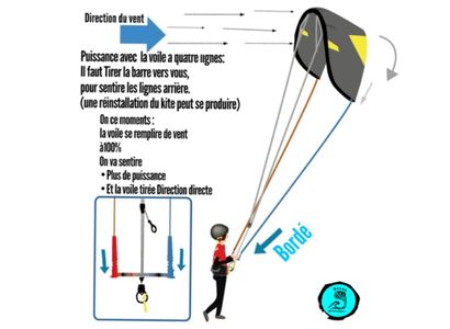 En tirant ou poussant la barre, vous jouez avec l’angle du kite et du vent. Si vous tirez la barre à vous, vous bordez le kite, ce dernier va avoir plus de puissance. Quand vous poussez la barre loin de vous, vous choquez le kite, vous avez donc moins de puissance c’est le « de-power ».