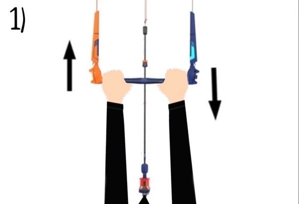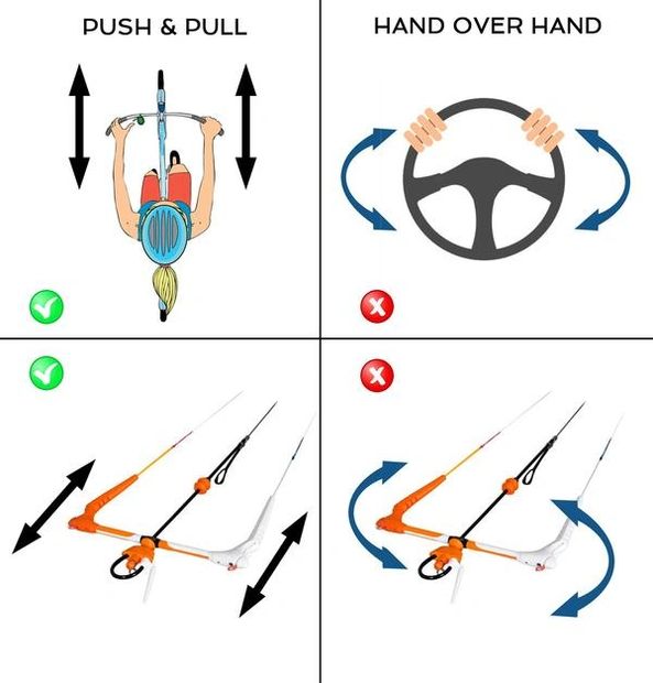 L’expérience nous a montré que l’erreur la plus commune est de croire qu’avec un kite de 4 lignes, il faut tirer avec les bras. Au contraire, vous pouvez contrôler le kite avec les 2 doigts car les lignes avant sont reliées au harnais. Il faut essayer de tirer avec 2 doigts pour sentir la tension dans les lignes arrière sans générer trop de puissance. C’est à ce moment que le kite volera de façon stable.