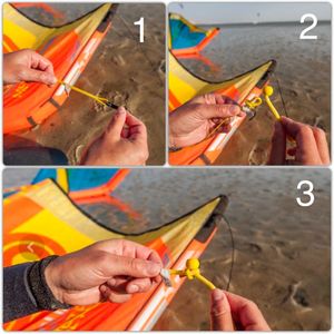 Avant d'entrer dans l'eau, assurez-vous de connaître et d'utiliser vos systèmes de sécurité. Les étapes 1 et 2 vous permettent de pratiquer sur terre, même sans vent. Veuillez noter que vous pratiquez toujours avec un kite surfeur expérimenté . Une fois que vous avez maîtrisé cela, pratiquez également les étapes 1 et 2 sur l'eau. De cette façon, vous vous sentez plus en sécurité et vous êtes préparé à des situations dangereuses lors de la navigation.