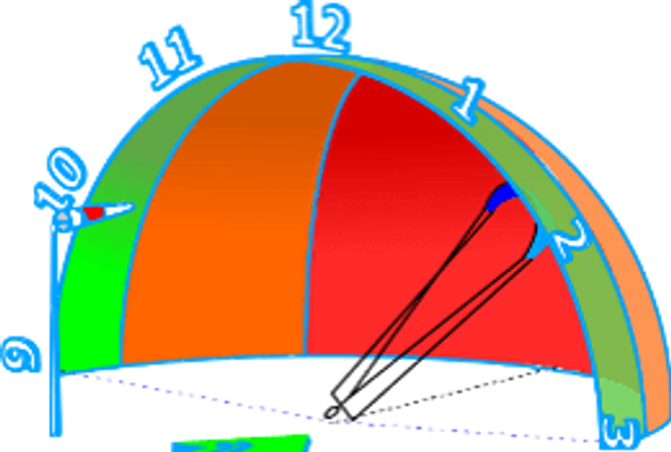 C’est l’endroit le plus loin où le kite peut voler et où il a le moins de puissance. Pour savoir où le kite se trouve sur le bord de fenêtre, nous la représentons comme une horloge. Quand le kite est au dessus de votre tête, il est à midi ou au zénith. A droite, vous descendez jusqu’à 3h et à gauche 9h. Vous pouvez décoller ou atterir le kite sur le bord de fenêtre à 3h ou à 9h. Ensuite vous envoyez lentement votre kite à 12h ou vous le descendez lentement de 12h. Imaginez un demi cercle, (un dôme) devant vous comme l’image ci-dessous, vous pouvez voir que le bord de fenêtre commence à 9h et finit à 3h.